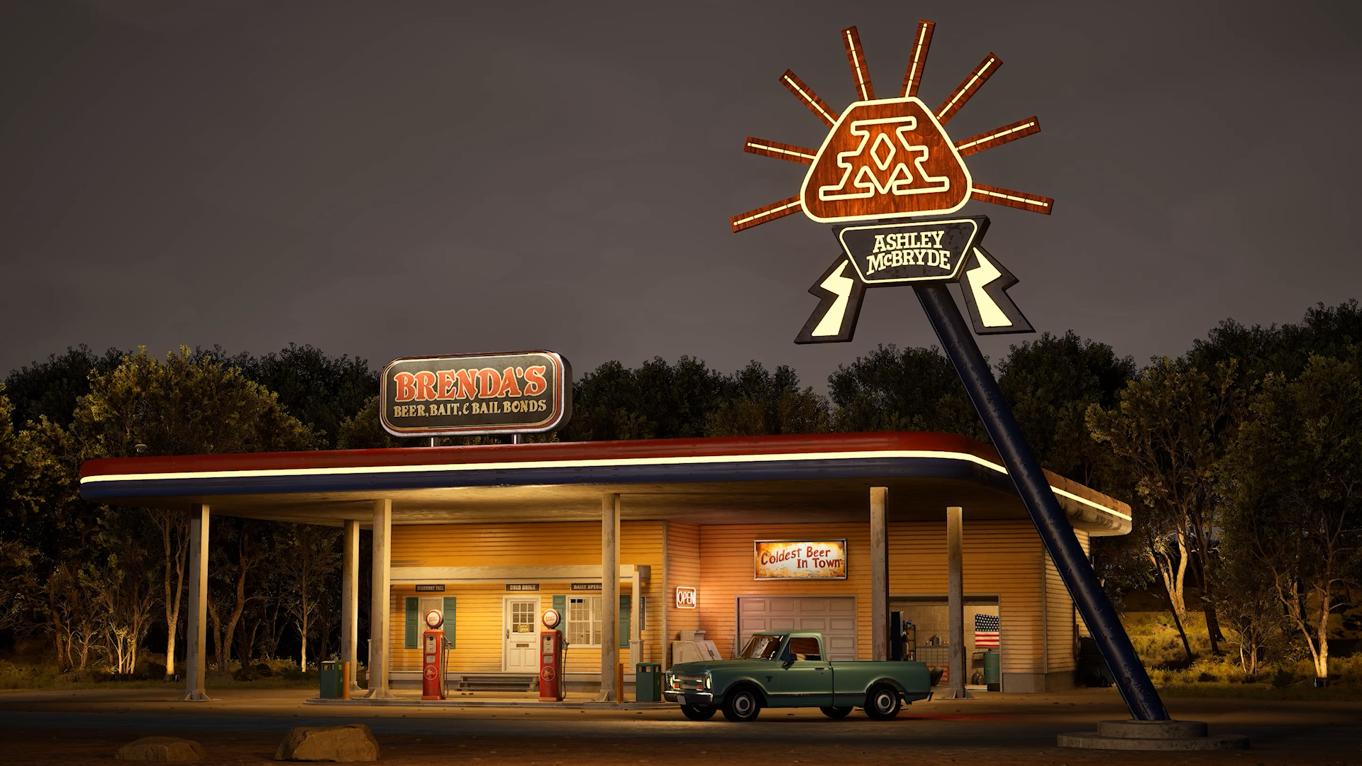 For Ashley’s live performance, I created a 45-minute 4K background video displayed on a large stage screen. The goal was to bring the atmosphere of Arkansas to a California stage, so I built a set of custom 3D elements — from the glowing AM and Beer signs to parts of a gas station and truck that framed the scene.